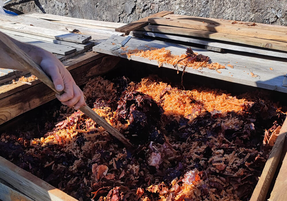 Após o processo de tingimento, os resíduos são compostados e utilizados para fertilizar o solo.