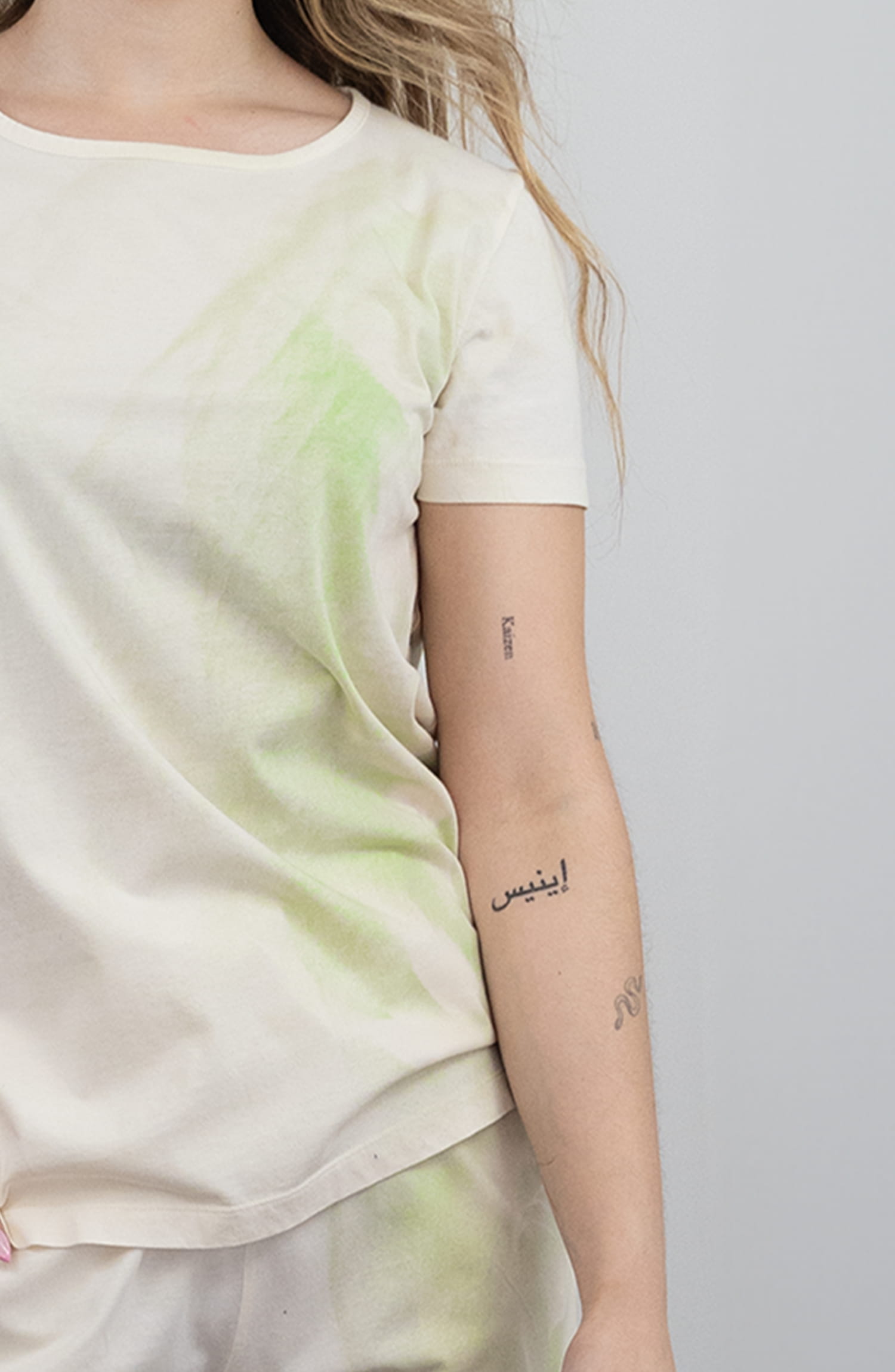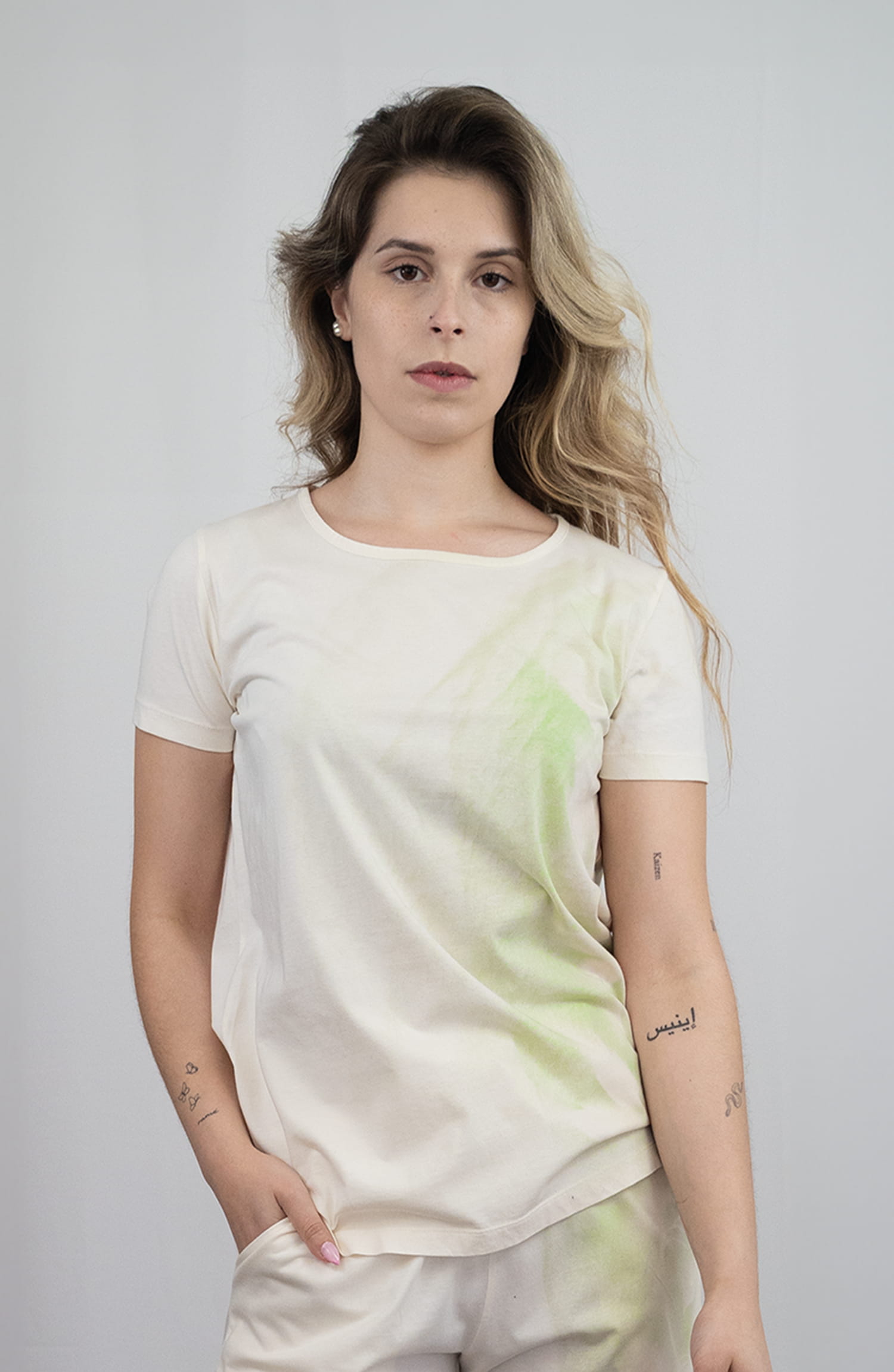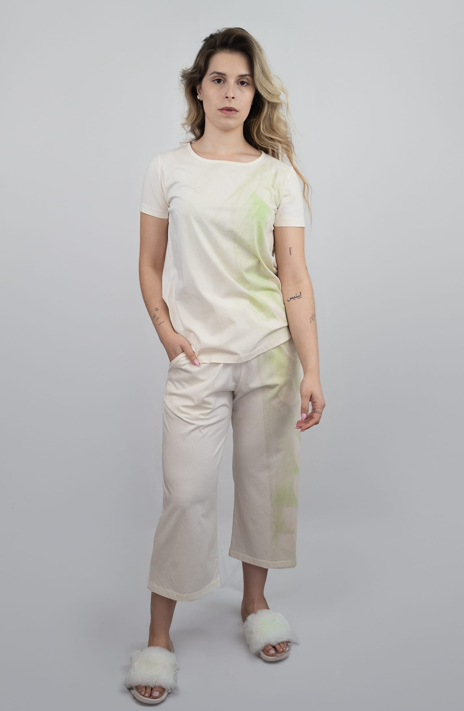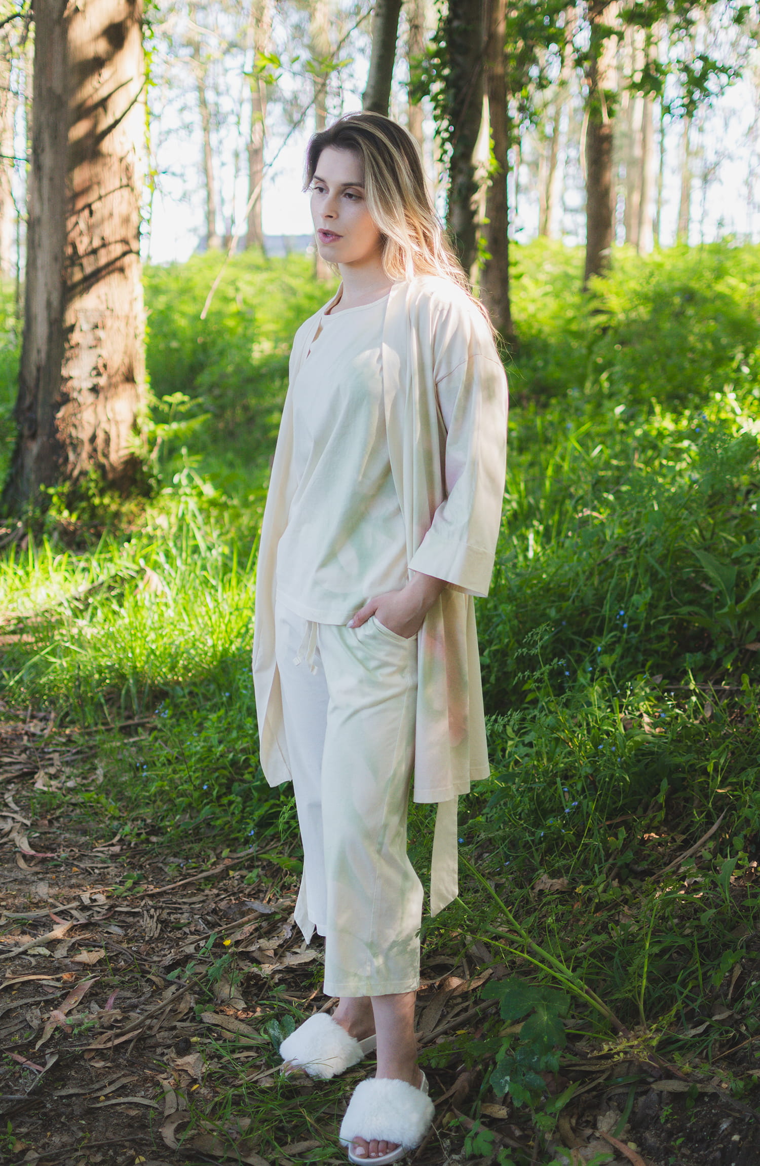 Pijama de mulher em algodão 100% orgânico com efeitos de spray natural de extrato de folhas de amoreira.
