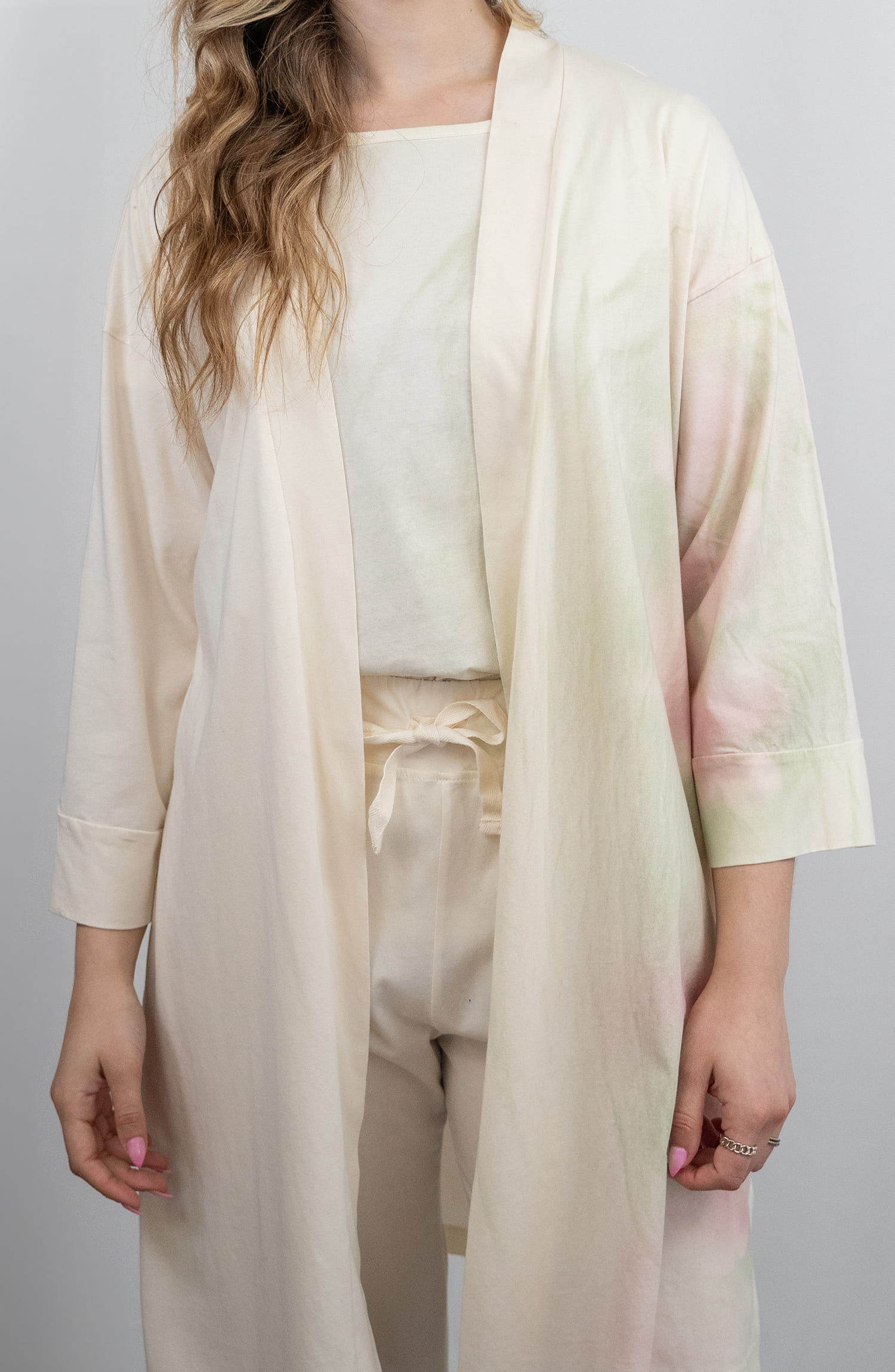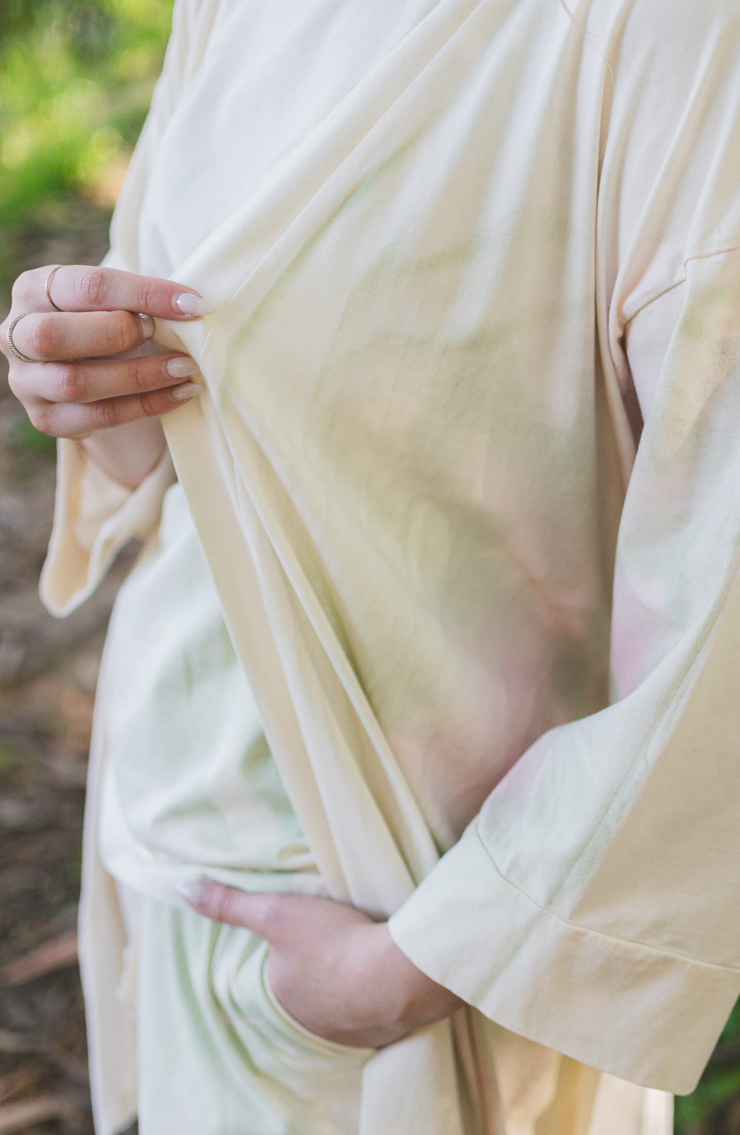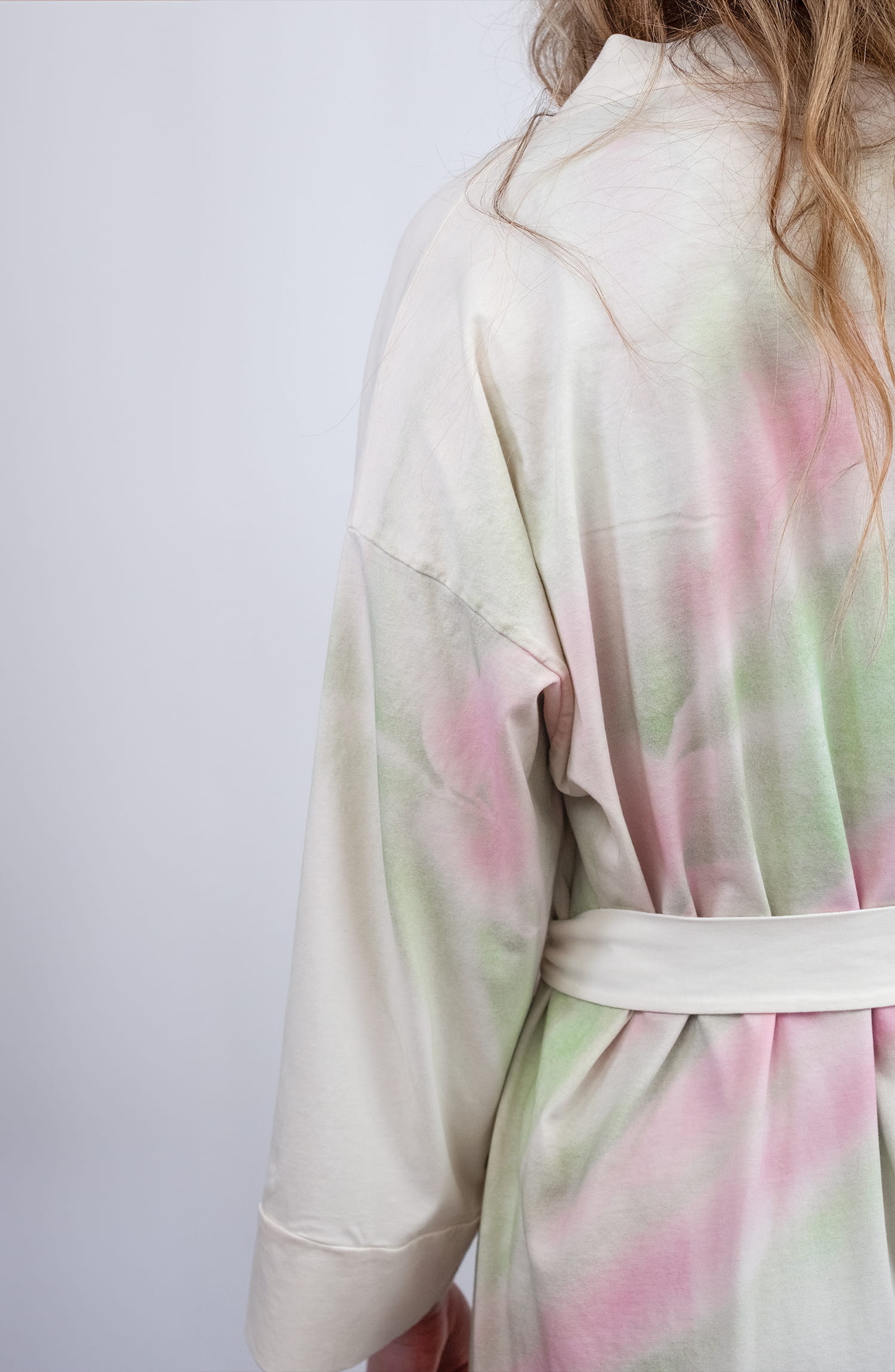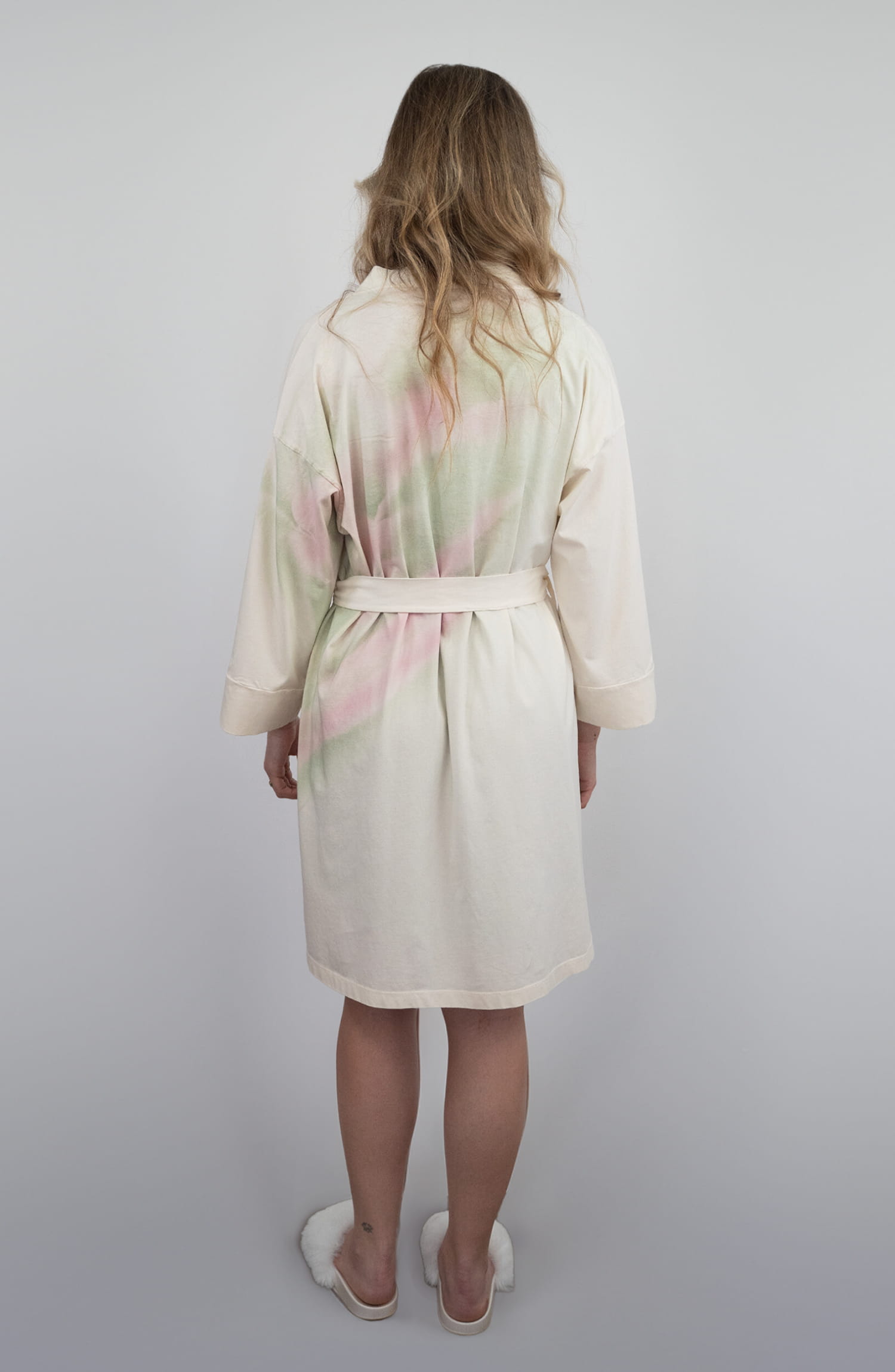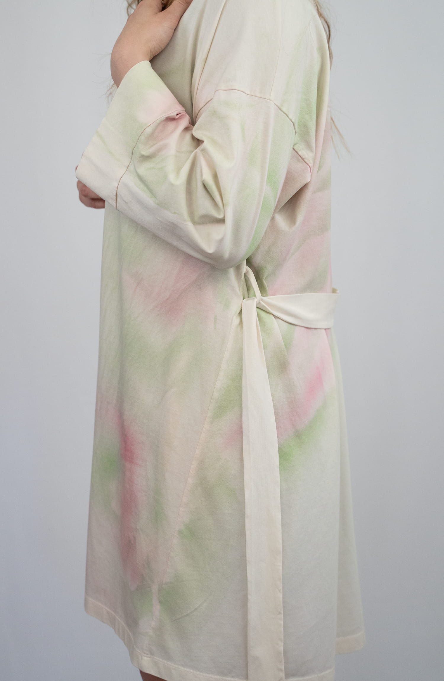 Robe de mulher elegante com cinto, em algodão orgânico, com toque macio e respirável em contato com a pele. O processo inclui a colocação manual de plantas sazonais, como hera e loureiro, diretamente sobre a peça. Sobre estas formas vegetais é aplicado manualmente, peça a peça, um spray de extrato de folhas de amoreira e goma laca, uma resina natural fisiologicamente inofensiva e biodegradável, segregada pela fêmea do inseto Lac – Kerria Lacca. O resultado são variações subtis e irrepetíveis de tons e padrões em verde e rosa. Cada peça é única!